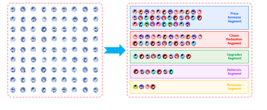 The illustration below shows how predictive micro segmentation transforms a broad, undifferentiated customer base into targeted groups aligned with specific business actions.